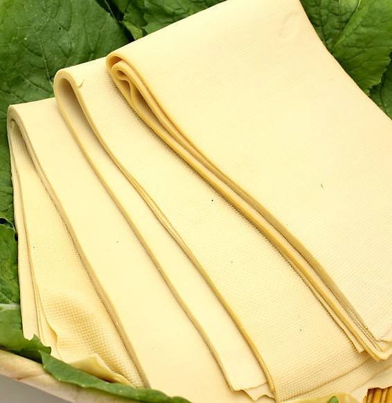 優(yōu)質(zhì)豆腐皮皮薄透明,半圓而不破,黃色有光澤,柔軟不粘,表面光滑、色澤乳白微黃光亮。