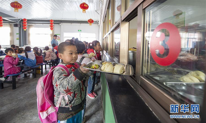 在西吉縣田坪鄉中心小學,學生排隊領取免費營養午餐(10月23日攝)。自實施農村義務教育學生營養改善計劃以來,寧夏回族自治區積極為農村學子提供免費的營養餐。從去年開始,寧夏固原市西吉縣的免費營養午餐迎來了升級換代,從原來的一道燴菜變成了如今的兩素一葷,餐具由餐桶換成了餐盤。在保證營養膳食搭配的同時,增加了學生的自主選擇性。從“吃得飽”到“吃得好”,升級換代的營養餐得到了廣大學生認可。(新華社發 楊植森/攝)
